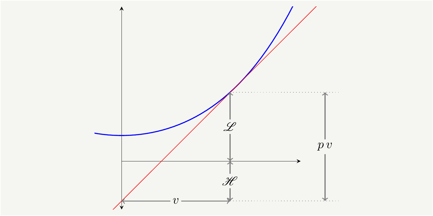 Consider the set up in Fig. 2 where we take a function \(\mathscr{L}(v)\) and draw a tangent line to it at a value of \(v\), which has a slope \(p=\mathscr{L}'(v)\) [3]. The height of the triangle can be computed as the slope multiplied by the base length.