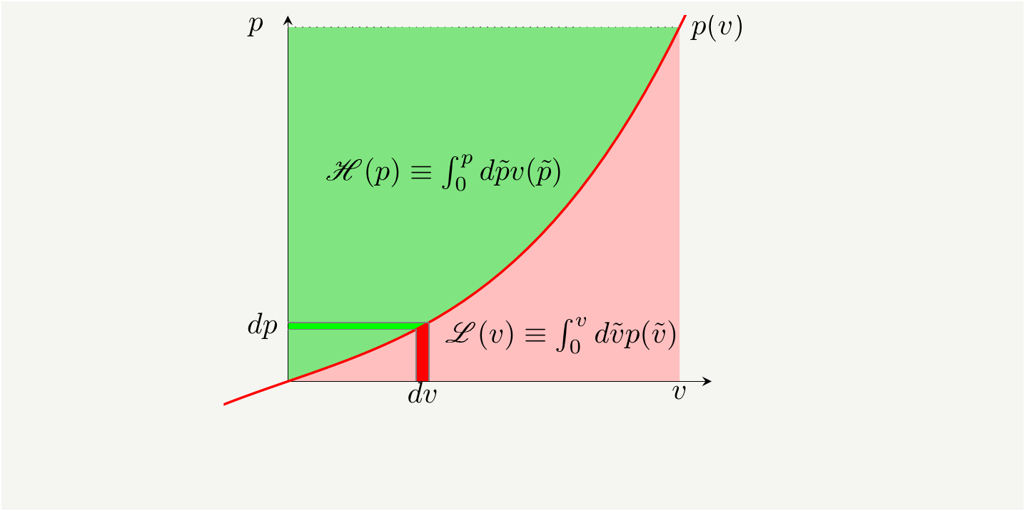 The shaded areas can be calculated using horizontal slices or vertical slices as follows: \[\begin{eqnarray} \mathscr{L}(v)\equiv\int_0^v d\tilde v p(\tilde v),\quad \text{and}\quad \mathscr{H}(p)\equiv\int_0^p d\tilde p v(\tilde p) \tag{18}. \end{eqnarray}\] As the areas add up to the area of the rectangle, we have
