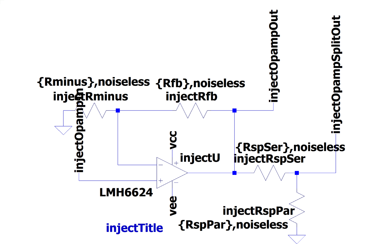 The thermal noise will appear at the OPAMP port. That noise is created by the real part of the equivalent impedance, which we will refer to as backwards impedance. Consider the read out port \(i\): \[\begin{eqnarray} Z^i_\text{BO}&\equiv&\text{para}\left( Z^i_\text{R,out},\text{para}\left(\vec{Z}_{N},\vec{Z}^{-i}_{R}\right)+Z^i_\text{R,in}\right)\tag{5}. \end{eqnarray}\] The notation needs some explanation:
